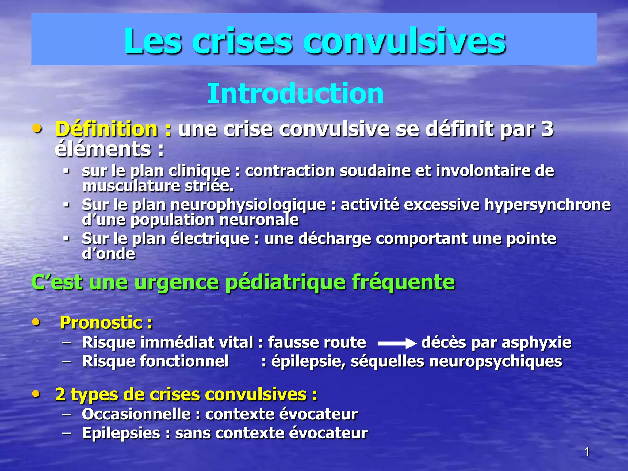 Le document traite des crises convulsives chez l'enfant, incluant leur définition, types, causes, manifestations cliniques et pronostics. Il distingue les crises fébriles et non fébriles, ainsi que divers traitements disponibles, y compris prophylactiques et symptomatiques. Enfin, il aborde les épilepsies de l'enfant, leurs étiologies et les modalités de diagnostic et de traitement.