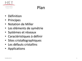 La cristallographie est une science qui étudie la formation et les caractéristiques géométriques des cristaux, distinguant entre solides cristallins et amorphes. Le document couvre les principes des structures cristallines, la notation de Miller, les systèmes et réseaux cristallins, ainsi que les types de défauts présents dans les cristaux. Les caractéristiques telles que la masse volumique, la coordinance et la compacité sont également abordées, illustrant leur impact sur les propriétés matérielles.