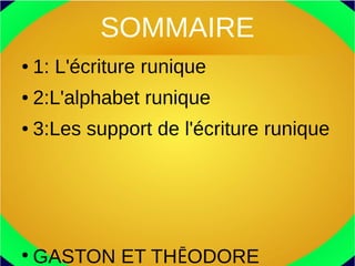 Le document traite de l'écriture runique, y compris de son alphabet, le futhark, utilisé par les peuples germaniques anciens. Il aborde les supports de cette écriture et mentionne des exemples comme la pierre de Rök. Les runes étaient initialement gravées pour des fonctions magiques.