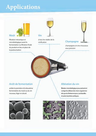 Le document présente un système de filtration douce et efficace pour les applications viticoles, permettant une filtration mécanique et microbiologique avant ou après la fermentation. Il met en avant les avantages d'un filtre tangentiel, incluant une préservation de la qualité du vin, un contrôle automatique du nettoyage et une réduction des besoins énergétiques et des coûts. Le système est modulable et adaptable à différents types de vin, garantissant une filtration optimale sans compromettre les caractéristiques organoleptiques.