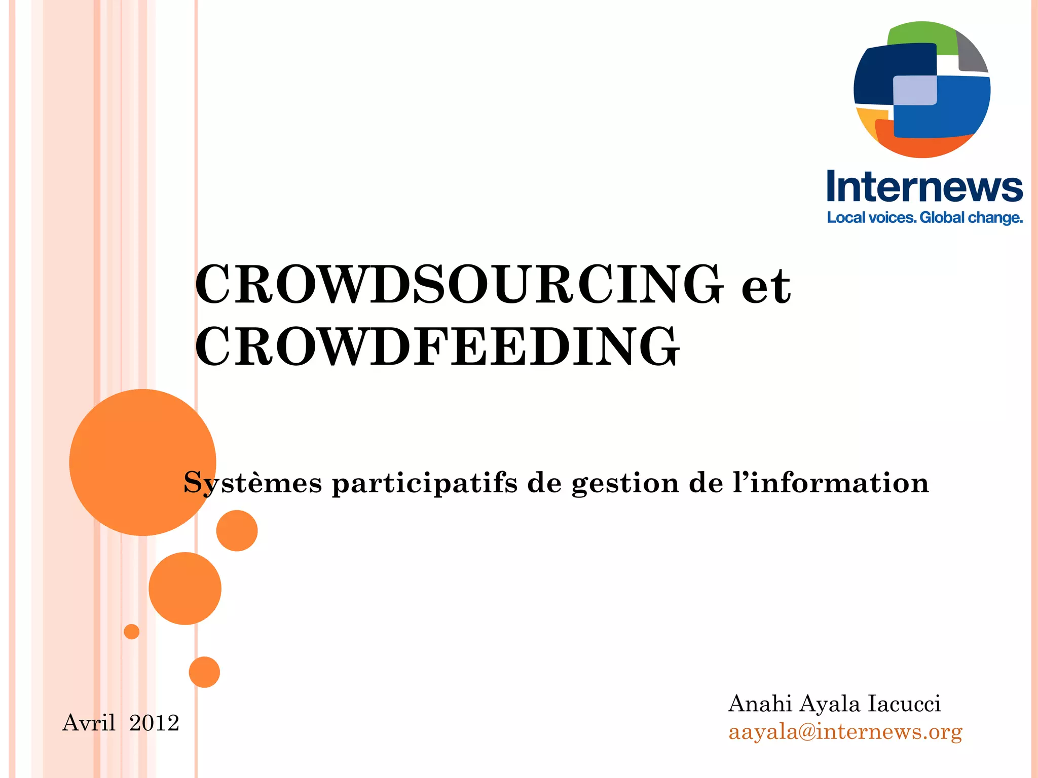 Le document traite du crowdsourcing, un mécanisme participatif permettant de collecter des informations en mobilisant une communauté à grande échelle, particulièrement lors de crises. Il souligne les avantages et méthodes variées de crowdsourcing ainsi que le concept de crowdfeeding, qui favorise le partage d'informations entre membres de la communauté. Enfin, il aborde les défis liés à la vérification des informations et à la durabilité des projets de crowdsourcing.