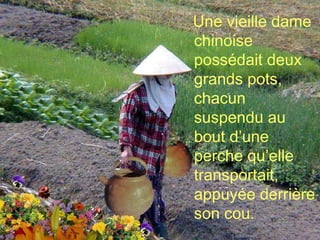 La légende du pot fêlé raconte l'histoire d'une vieille dame chinoise qui transporte deux pots, dont l'un est fêlé et se sent honteux de sa faiblesse. Toutefois, la dame révèle que les fêlures du pot ont permis de faire pousser des fleurs le long du chemin, apportant beauté et joie à leur quotidien. Cette parabole souligne que nos imperfections peuvent enrichir nos vies et celles des autres.