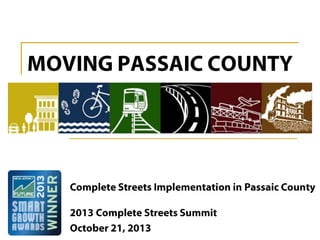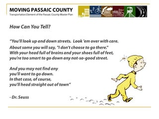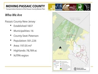 The document discusses the transportation element of the Passaic County Master Plan, focusing on before and after scenarios. It highlights community and stakeholder perspectives, emphasizing the importance of addressing transportation needs in the region.