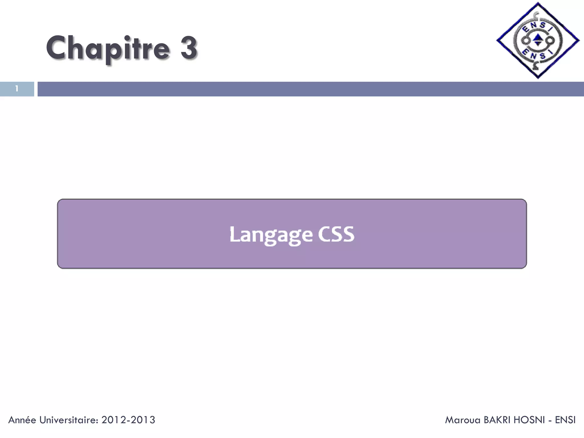 Le document présente un chapitre sur le CSS, incluant des thèmes tels que la syntaxe du CSS, l'héritage, et l'organisation du code CSS. Il traite également des classes, des ID, des balises div et span, ainsi que de la mise en forme du texte, des fonds de page, des liens, des listes et des éléments flottants. Ce chapitre vise à fournir une compréhension approfondie des éléments clés du CSS pour les étudiants universitaires.