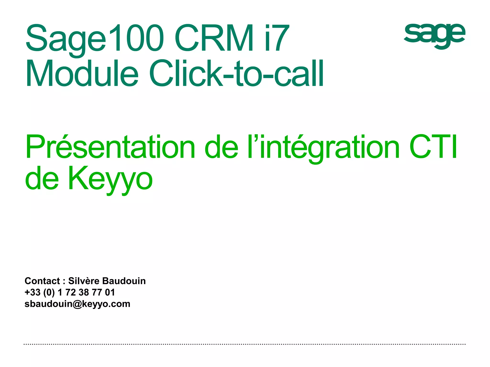 Le document présente l'intégration CTI de Keyyo avec le module Click-to-Call de Sage100 CRM, mettant en avant leurs services télécoms. Keyyo est une entreprise française créée en 1994, comptant plus de 10 000 clients et se concentrant sur la qualité de service et l'innovation. Il décrit également les fonctionnalités du système, comme le suivi des appels entrants et sortants, ainsi que la gestion des communications.