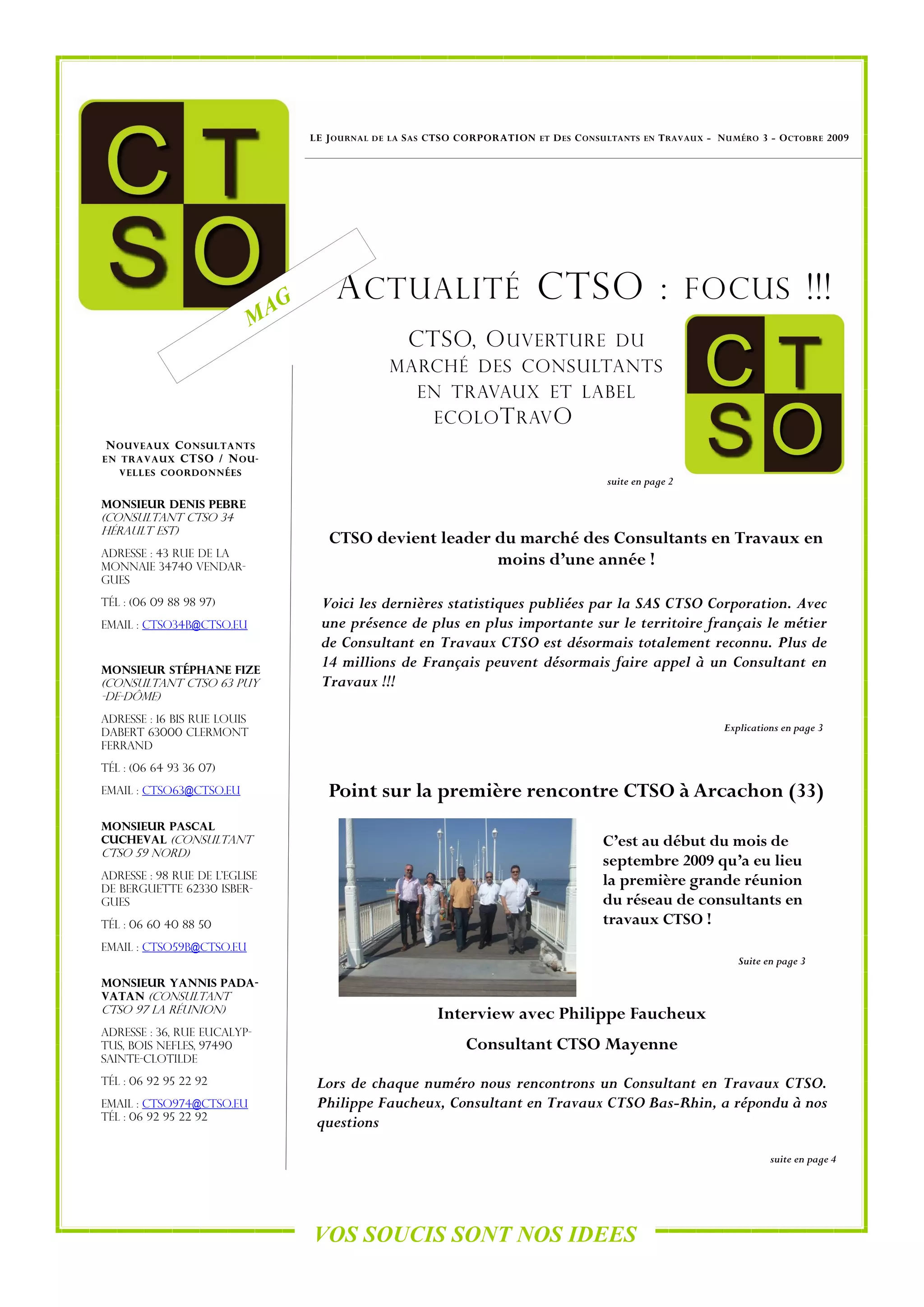 La SAS CTSo Corporation, en moins d'un an, est devenue le leader du marché des consultants en travaux en France, permettant à plus de 14 millions de Français de faire appel à ses services. Le modèle CTSo facilite la mise en relation entre artisans et clients, avec un accent sur la garantie de qualité et les préoccupations écologiques des projets. La première grande réunion du réseau des consultants en travaux a eu lieu à Arcachon en septembre 2009, soulignant la dynamique et le professionnalisme du réseau.