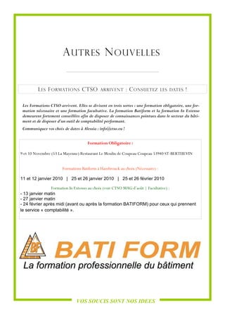 Le numéro de novembre 2009 du journal de la CTSO corporation présente les prochaines formations, notamment la formation obligatoire et les formations facultatives recommandées pour le secteur du bâtiment. Il annonce également l'expansion du réseau CTSO en Belgique et au Luxembourg, ainsi que la refonte du site internet pour une meilleure visibilité et accessibilité. En outre, une boîte à idées est lancée pour encourager la contribution des consultants au réseau.