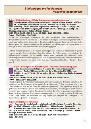 Le document présente un aperçu des nouvelles acquisitions en bibliothéconomie, abordant les innovations technologiques et leur impact sur le rôle des bibliothécaires ainsi que la médiation numérique. Il traite également de l'évolution des catalogues de bibliothèques, des collections régionales, et des outils informatiques utilisés dans les bibliothèques, tout en examinant l'histoire des bibliothèques et l'importance de la culture au sein de l'Union européenne. Enfin, il présente des ressources pratiques pour la gestion des photothèques et des bibliothèques.