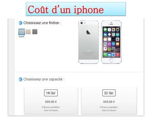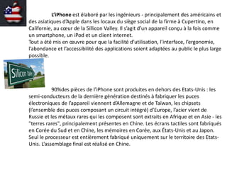 L'iPhone est conçu par des ingénieurs d'Apple en Californie, avec 90% de ses composants provenant de l'étranger. Les coûts de production, estimés entre 160 et 190 euros, ainsi que les stratégies de marketing de masse permettent à Apple d'atteindre une clientèle large. Le transport rapide des iPhones au moment de leur lancement, intégrant le coût dans le prix de vente, est essentiel pour leur distribution efficace.
