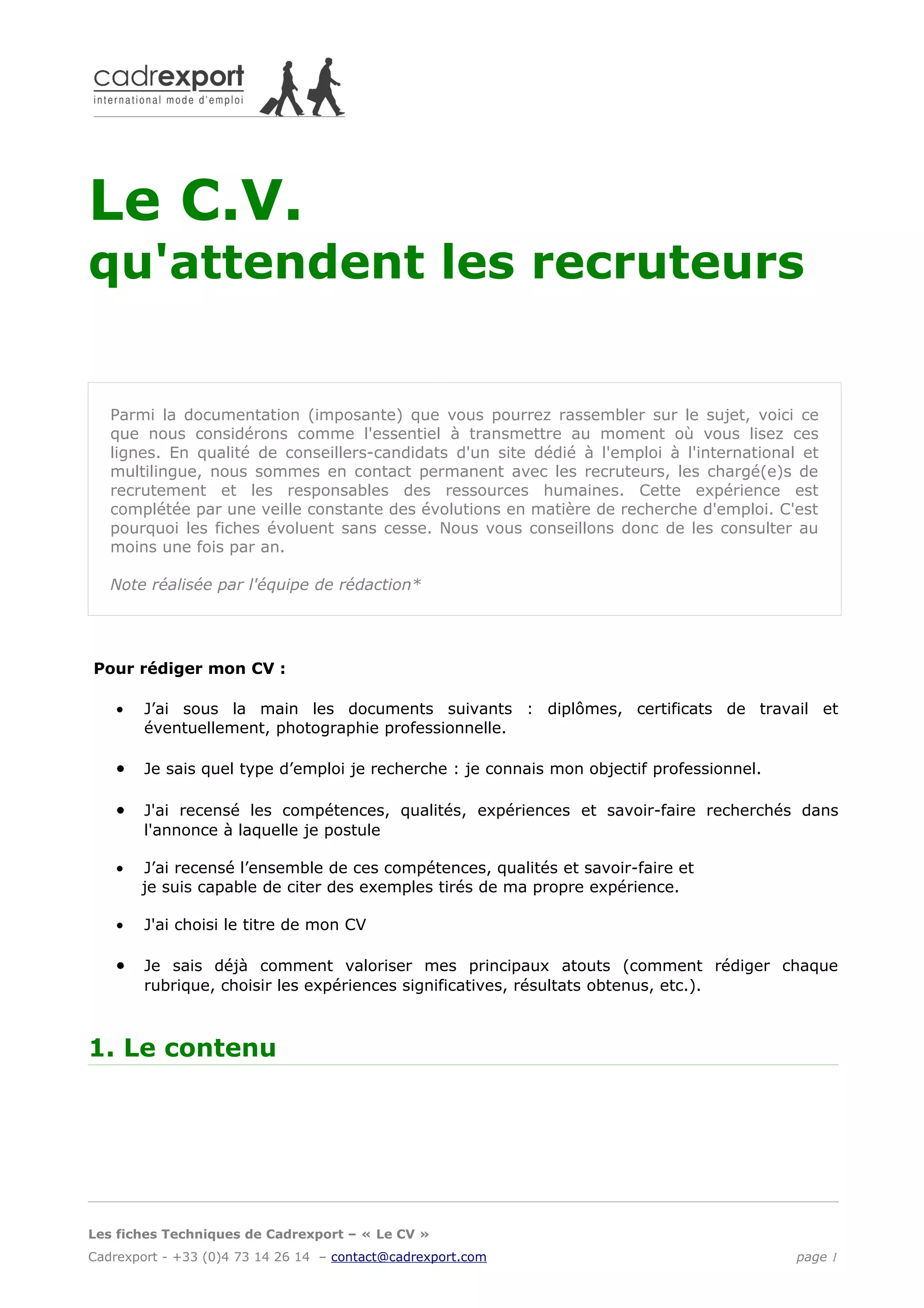 Le document fournit des conseils pratiques sur la rédaction d'un CV efficace, en insistant sur l'importance de la clarté, de la précision et de la structure. Il aborde les éléments essentiels à inclure, comme les informations personnelles, les expériences professionnelles et les compétences, tout en recommandant de personnaliser le CV selon chaque offre d'emploi. Des recommandations supplémentaires concernant la présentation et les erreurs à éviter sont également fournies pour maximiser les chances de succès auprès des recruteurs.