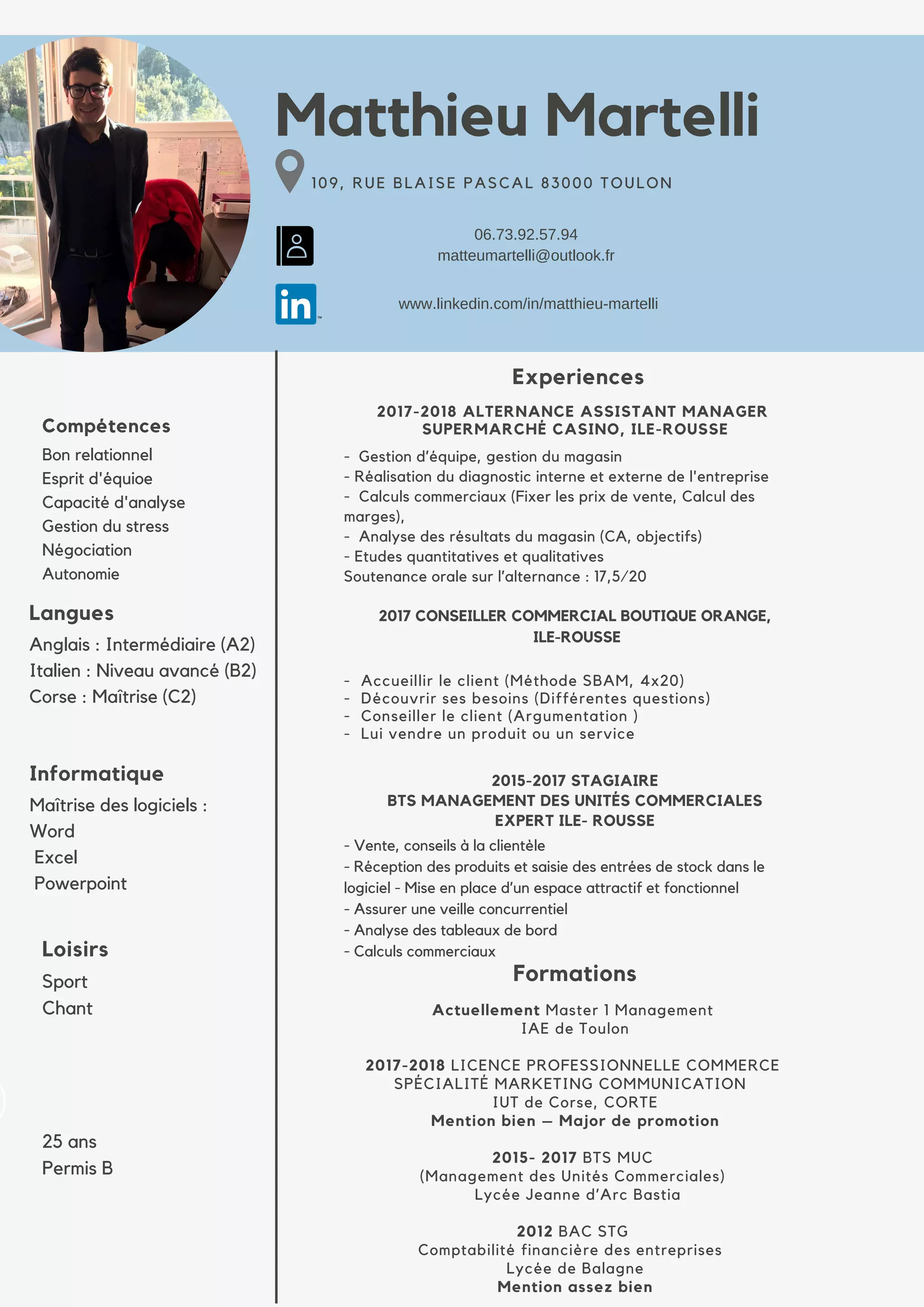Matthieu Martelli est un professionnel avec une expérience en gestion et en vente, ayant travaillé comme assistant manager et conseiller commercial. Il possède des compétences en langues (anglais, italien, corse) et en logiciels de bureautique, ainsi qu'un parcours académique notable en management et commerce. Actuellement, il poursuit un master en management à Toulon et affiche une solide expérience en analyse commerciale et gestion d'équipe.