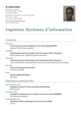 Daoud Cherif, ingénieur en systèmes d'information, est né le 20 avril 1986 à Nabeul, Tunisie. Il possède une formation en ingénierie avec des compétences variées en développement, gestion de bases de données, et administration des systèmes et réseaux. Il parle plusieurs langues et a participé à divers projets professionnels, renforçant son expertise en technologies de l'information.