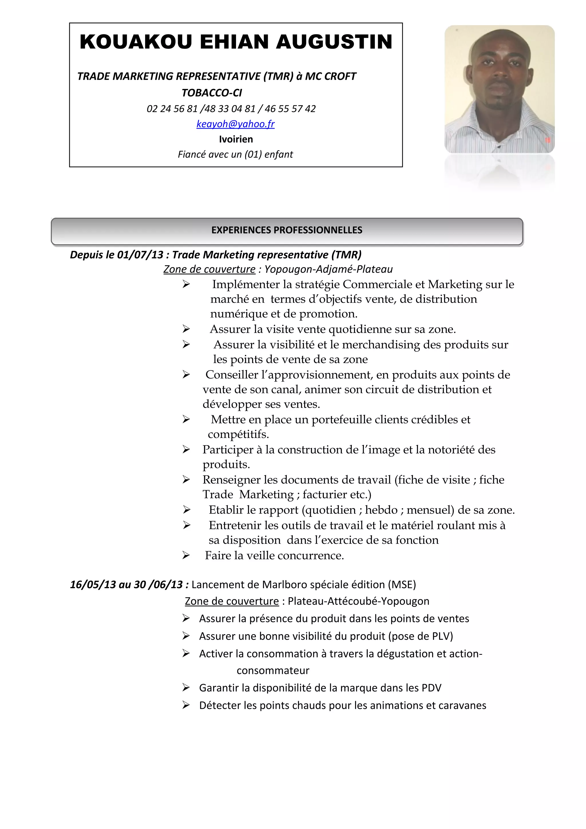 Kouakou Ehian Augustin est un représentant en trade marketing chez Mc Croft Tobacco-CI avec plusieurs années d'expérience dans le domaine, depuis 2013. Il a développé des stratégies commerciales, assuré la visibilité des produits et entretenu des relations avec les points de vente dans diverses zones d'Abidjan. Il possède des compétences en gestion et parle plusieurs langues, tout en étant impliqué dans des activités associatives et sportives.