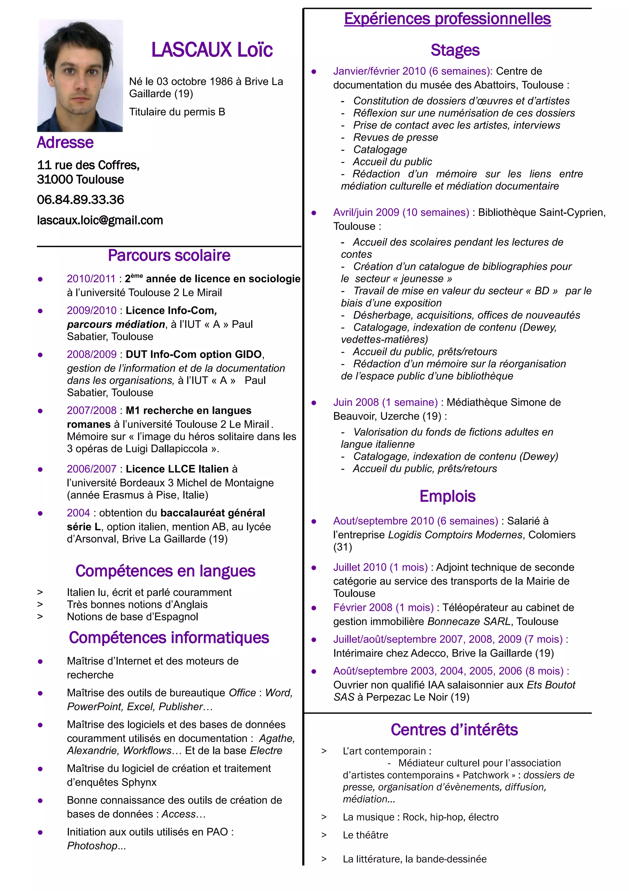 Le document présente le parcours scolaire et professionnel de Loïc Lascaux, incluant plusieurs stages dans des bibliothèques et médiathèques, ainsi que des expériences variées dans le domaine de l'information et de la documentation. Il détaille également ses compétences linguistiques et informatiques, ainsi que ses intérêts pour l'art contemporain, la musique, le théâtre et la littérature. Enfin, il mentionne ses emplois antérieurs et ses études universitaires en sociologie et information-communication.