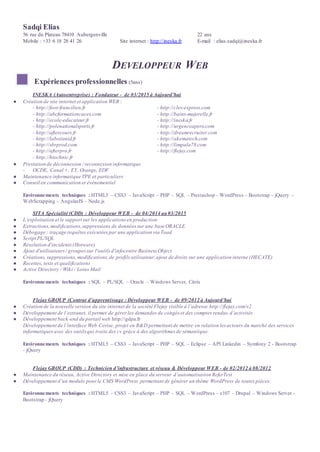 Elias Sadqi est un développeur web de 22 ans avec 5 ans d'expérience, fondateur de l'auto-entreprise Ineska, où il crée des sites et applications web, ainsi que propose des services de maintenance informatique. Il a travaillé pour Sita et Flejay Group, développant divers projets techniques en utilisant des environnements tels que PHP, SQL et JavaScript. Elias détient un BTS en informatique et réseaux, ainsi qu'un bac pro en systèmes électroniques et numériques.