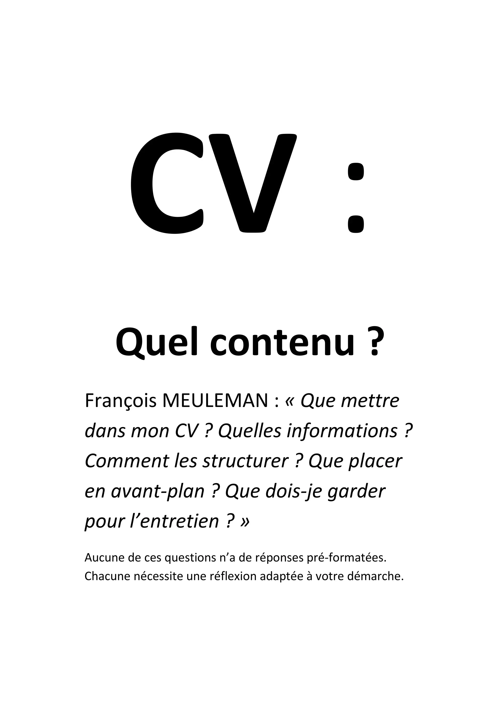 Ce document fournit des conseils sur la rédaction d'un CV efficace, en insistant sur l'importance d'adapter son contenu à chaque entreprise et poste visé. Il aborde des stratégies de structuration et de mémorisation pour captiver l'attention des recruteurs tout en évitant les erreurs courantes. Enfin, il souligne la nécessité de susciter l'intérêt du recruteur et de présenter ses expériences de manière concise et pertinente.