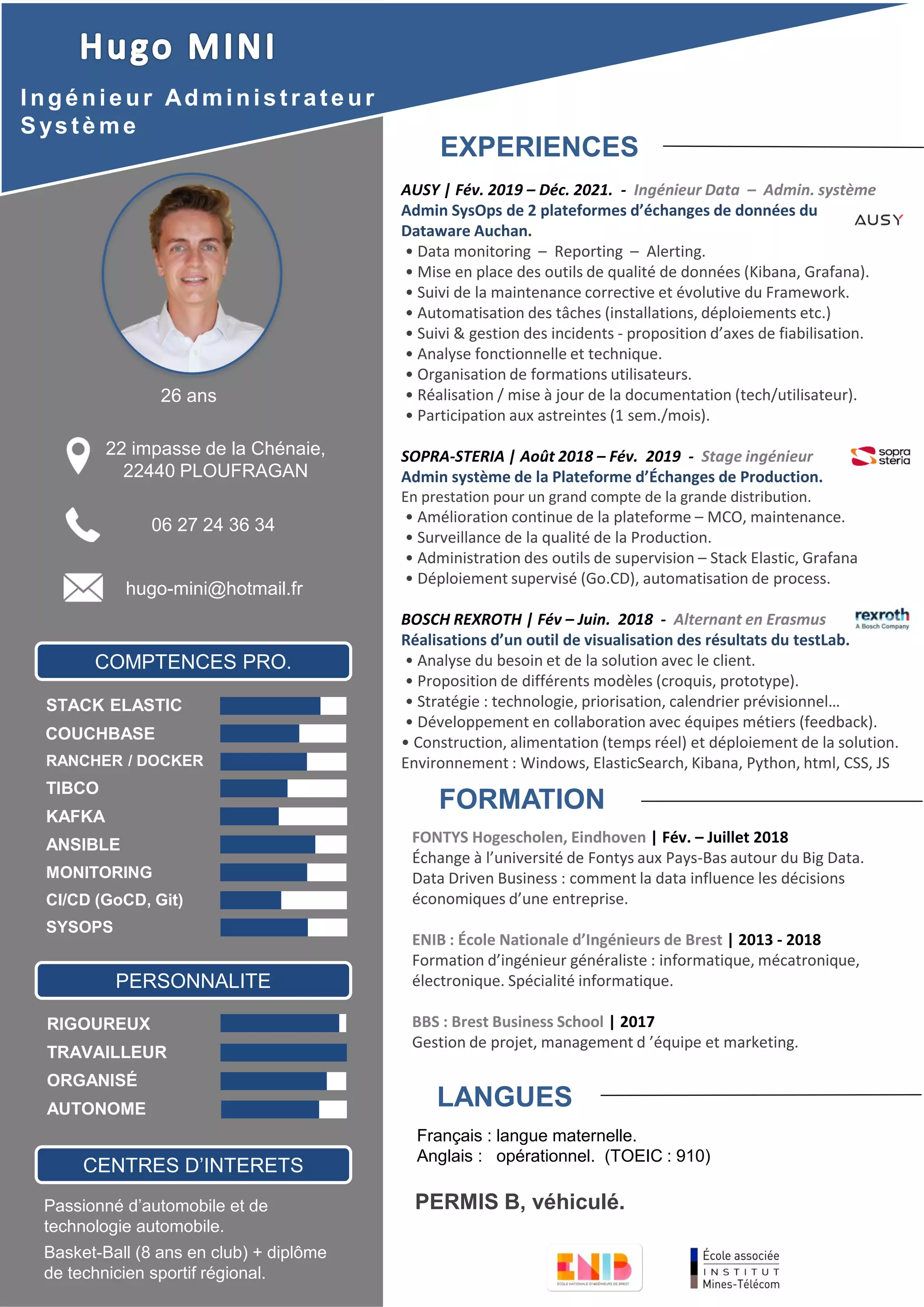 Le document présente le parcours académique et professionnel d'un ingénieur en informatique. Il détaille son expérience en gestion de données, avec des compétences en monitoring, automatisation et administration de systèmes, ainsi que son passion pour l'automobile et son engagement dans le basket-ball. L'individu a travaillé dans diverses entreprises, renforçant ses compétences en big data et en qualité des données.