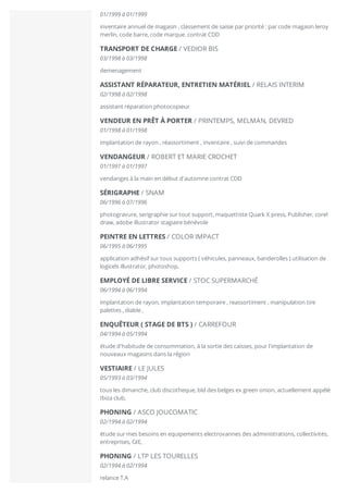 Le document présente un ensemble de compétences et d'expériences professionnelles variées, notamment dans la logistique, la vente et le service client. Il décrit également des formations et des engagements bénévoles depuis 1990, mettant en avant des rôles dans divers secteurs. Une polyvalence linguistique en français, anglais, allemand et espagnol est également mentionnée.