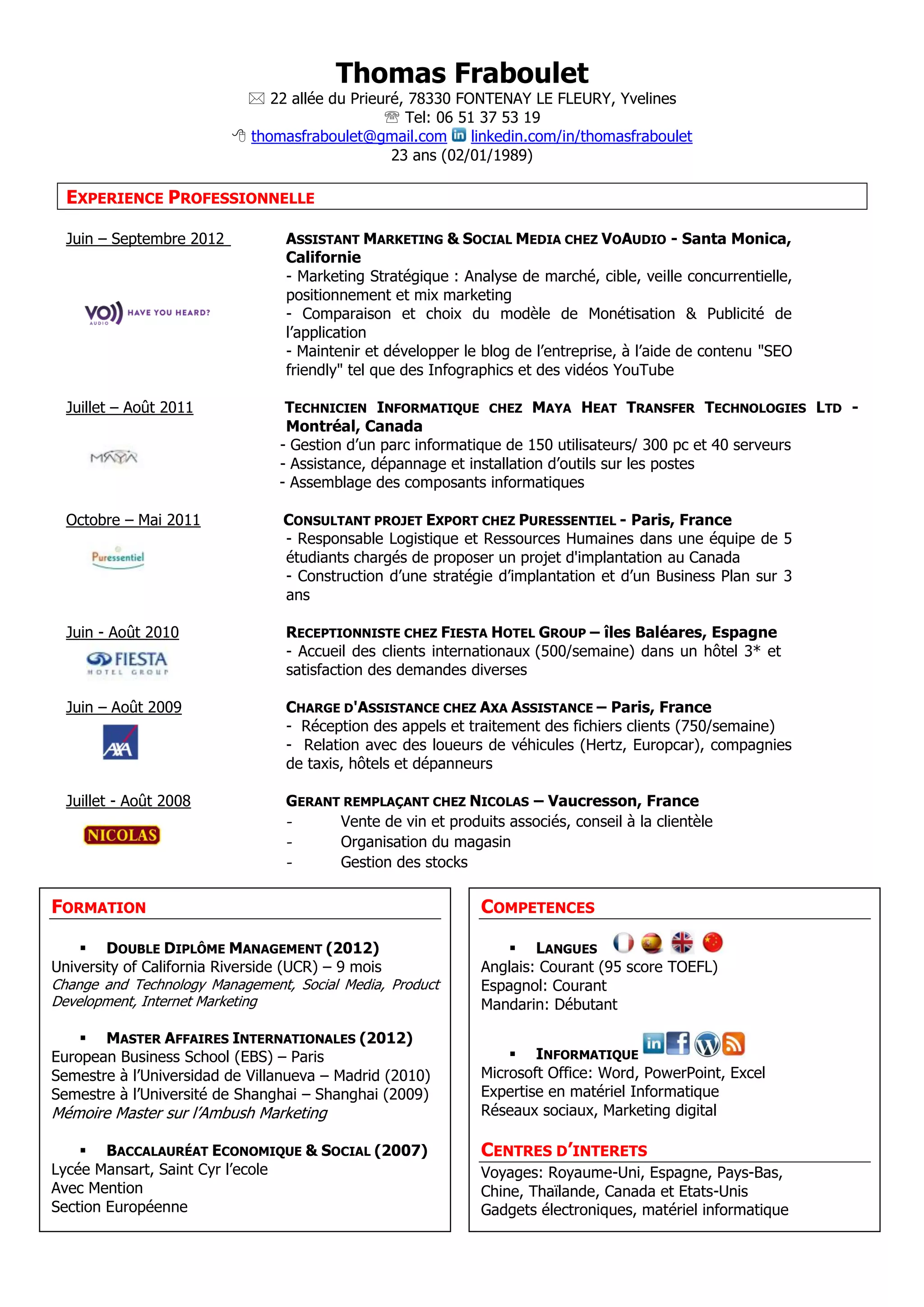 Thomas Fraboulet, 23 ans, est un professionnel du marketing et des technologies de l'information ayant une expérience variée dans des rôles tels qu'assistant marketing à VoAudio en Californie et technicien informatique à Maya Heat Transfer à Montréal. Il détient un double diplôme en management et un master en affaires internationales, ainsi qu'une expertise en marketing digital et gestion de projets. Ses compétences linguistiques incluent l'anglais courant, l'espagnol courant et le mandarin débutant.