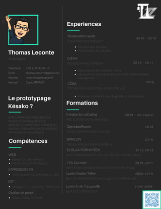 Thomas Leconte est un développeur web junior basé à Caen, France, avec des compétences en HTML/CSS, PHP/MySQL, et des projets en impression 3D et IoT. Il a une expérience variée allant de la gestion de projets numériques à des rôles polyvalents dans la restauration et la vente. Thomas détient une formation en management et en systèmes électroniques, et est capable de réaliser des études de faisabilité pour des projets physiques ou numériques.