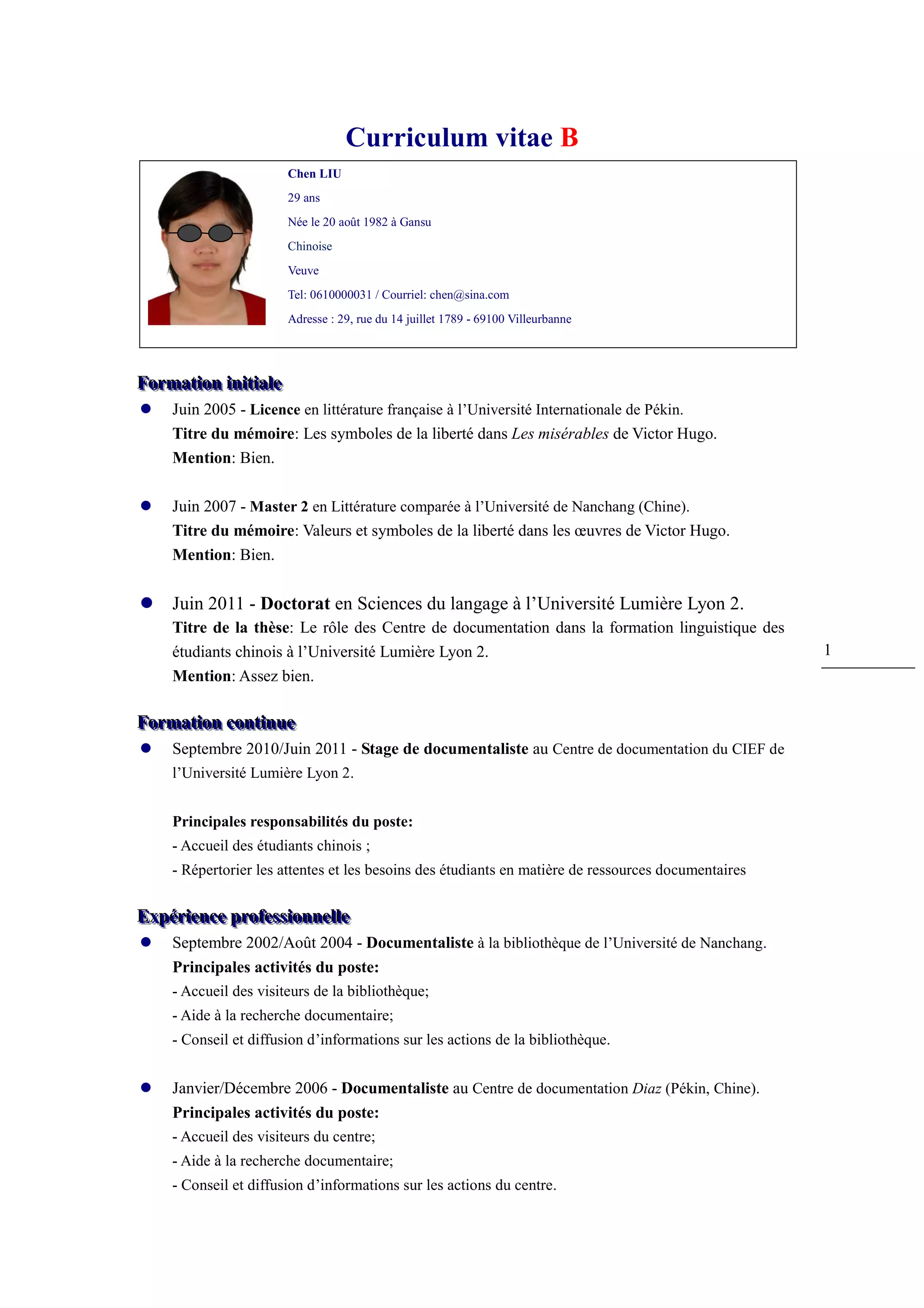 Chen Liu, 29 ans, possède un doctorat en sciences du langage et une solide formation en littérature française, avec des thèses portant sur Victor Hugo. Elle a une expérience professionnelle en tant que documentaliste dans plusieurs institutions, notamment en Chine et à Lyon, et maîtrise plusieurs outils informatiques ainsi que plusieurs langues. Ses compétences incluent également un engagement actif envers la recherche documentaire et l'accueil des étudiants.