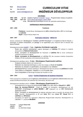Shimon Zerbib est un ingénieur développeur avec un master en systèmes d'information et un diplôme en informatique. Il a une expérience professionnelle allant de 2000 à 2009, travaillant dans le développement de logiciels en C++ et LabVIEW pour des entreprises comme Technoplus Industries et S.A.S.I. Il maîtrise le français, l'hébreu et a une bonne connaissance de l'anglais.