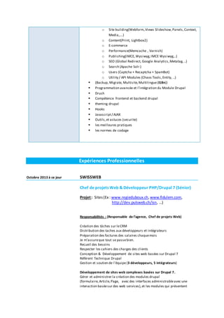 Le document présente le parcours professionnel d'un ingénieur en études et développement PHP, spécialisé en Drupal, avec un master en informatique et plusieurs expériences en développement web. Il détaille ses compétences techniques en PHP, MySQL, Symfony, Drupal et d'autres outils, ainsi que ses rôles dans la gestion de projets, le développement de sites complexes et l'encadrement d'équipes. Le professionnel a travaillé pour divers clients, créant et optimisant des solutions Drupal tout en s'assurant de respecter les normes et meilleures pratiques.