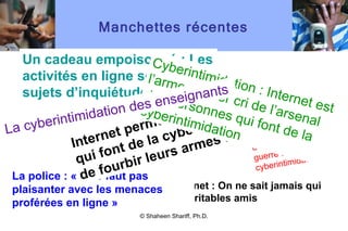 Le document aborde la complexité de la cyberintimidation, de la cyberdiffamation et des plaisanteries en ligne, en soulignant les zones floues entre comportements sociaux et criminels. Il examine des cas de menaces et de commentaires nuisibles sur les réseaux sociaux, révélant les défis rencontrés par la législation face à l'évolution rapide de la technologie et à l'anonymat en ligne. La question de la responsabilité des plateformes et des établissements scolaires face à ces comportements est également soulevée.