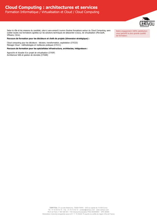 La formation sur le cloud computing proposée par Certyou offre une connaissance approfondie des composants, architectures et acteurs du secteur. Destinée à un public varié, notamment les responsables IT et les consultants, le programme inclut des études de cas et une approche pratique des solutions actuelles. La formation de trois jours comprend également un coaching post-cours pour garantir l'atteinte des objectifs d'apprentissage.