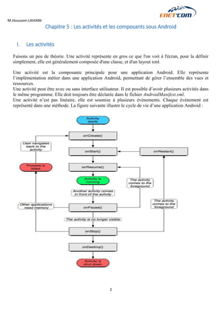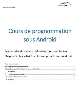 Le document présente un cours de programmation sous Android, axé sur les activités et les composants. Il explique le cycle de vie d'une activité, les différentes méthodes associées à cet événement, ainsi que l'utilisation de composants comme les boutons radio et les alertes. Des exercices pratiques sont fournis pour illustrer l'application des concepts abordés.