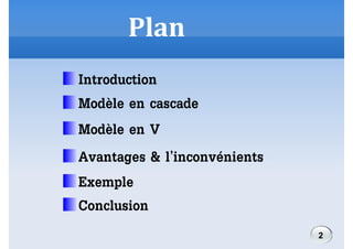 Le document présente les différents modèles de cycle de vie du logiciel, notamment le modèle en cascade et le modèle en V, en détaillant leurs avantages et inconvénients. Le modèle en cascade est caractérisé par un processus linéaire avec des validations tardives, tandis que le modèle en V met l'accent sur les vérifications tout au long du développement. Il conclut que le choix du modèle dépend des circonstances, avec des risques associés aux développements innovants.