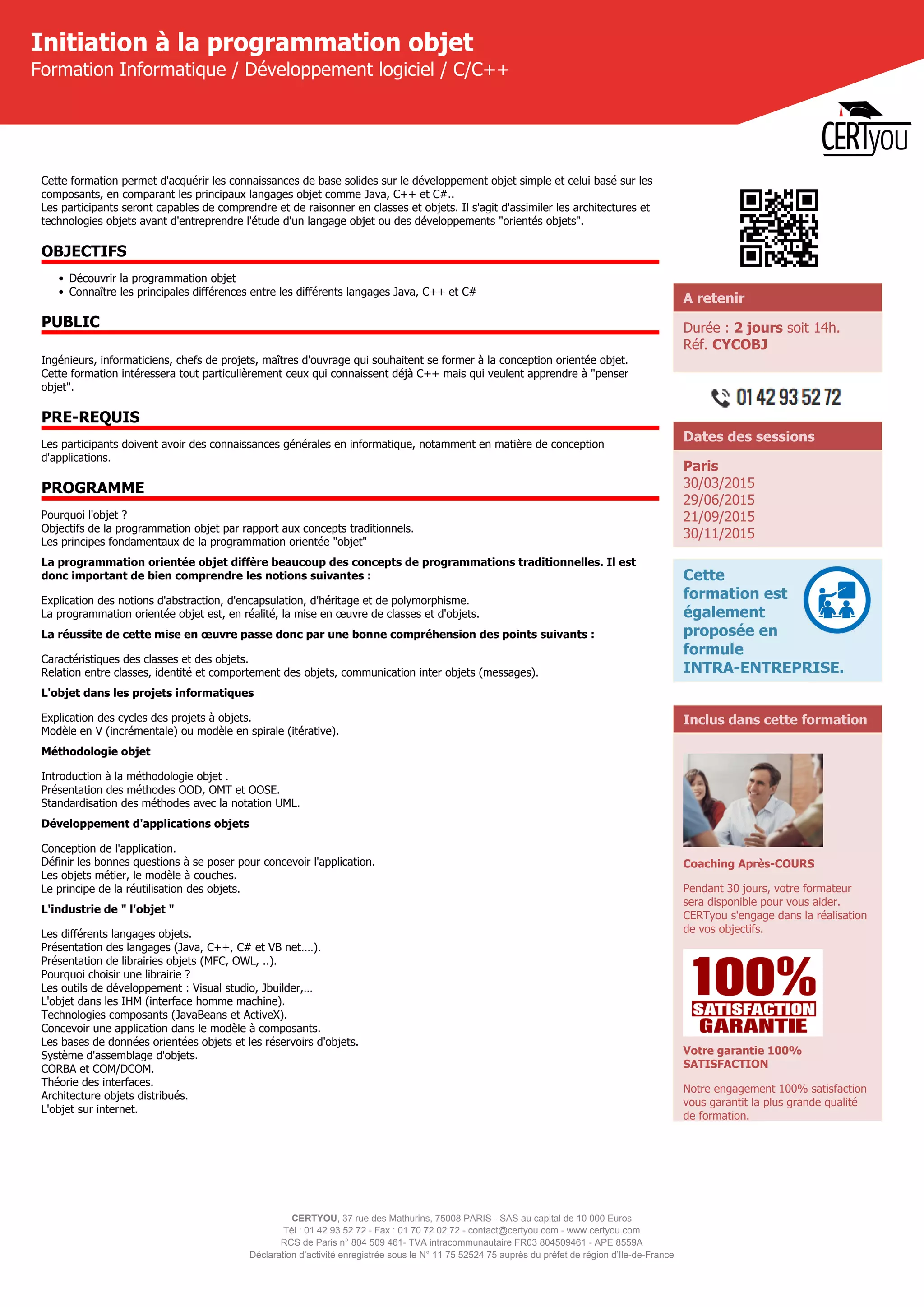 Certyou propose une formation de deux jours sur l'initiation à la programmation orientée objet, destinée aux ingénieurs et chefs de projet souhaitant acquérir des connaissances solides sur le développement logiciel en C, C++, Java et C#. La formation aborde des concepts fondamentaux tels que l'abstraction, l'encapsulation, l'héritage et le polymorphisme, ainsi que l'utilisation de différentes méthodologies et outils de développement. Après la formation, un coaching de 30 jours est inclus pour accompagner les participants dans l'application de leurs nouvelles compétences.
