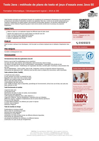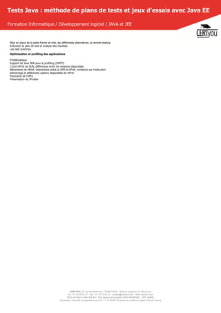 La formation proposée par Certyou pour les tests Java EE vise à doter les participants des compétences nécessaires pour automatiser les tests d'applications web Java. Elle aborde divers types de tests, l'utilisation d'outils open source, et les méthodologies modernes comme l'Extreme Programming. La formation est destinée aux développeurs, chefs de projet et architectes, avec un engagement de satisfaction à 100%.