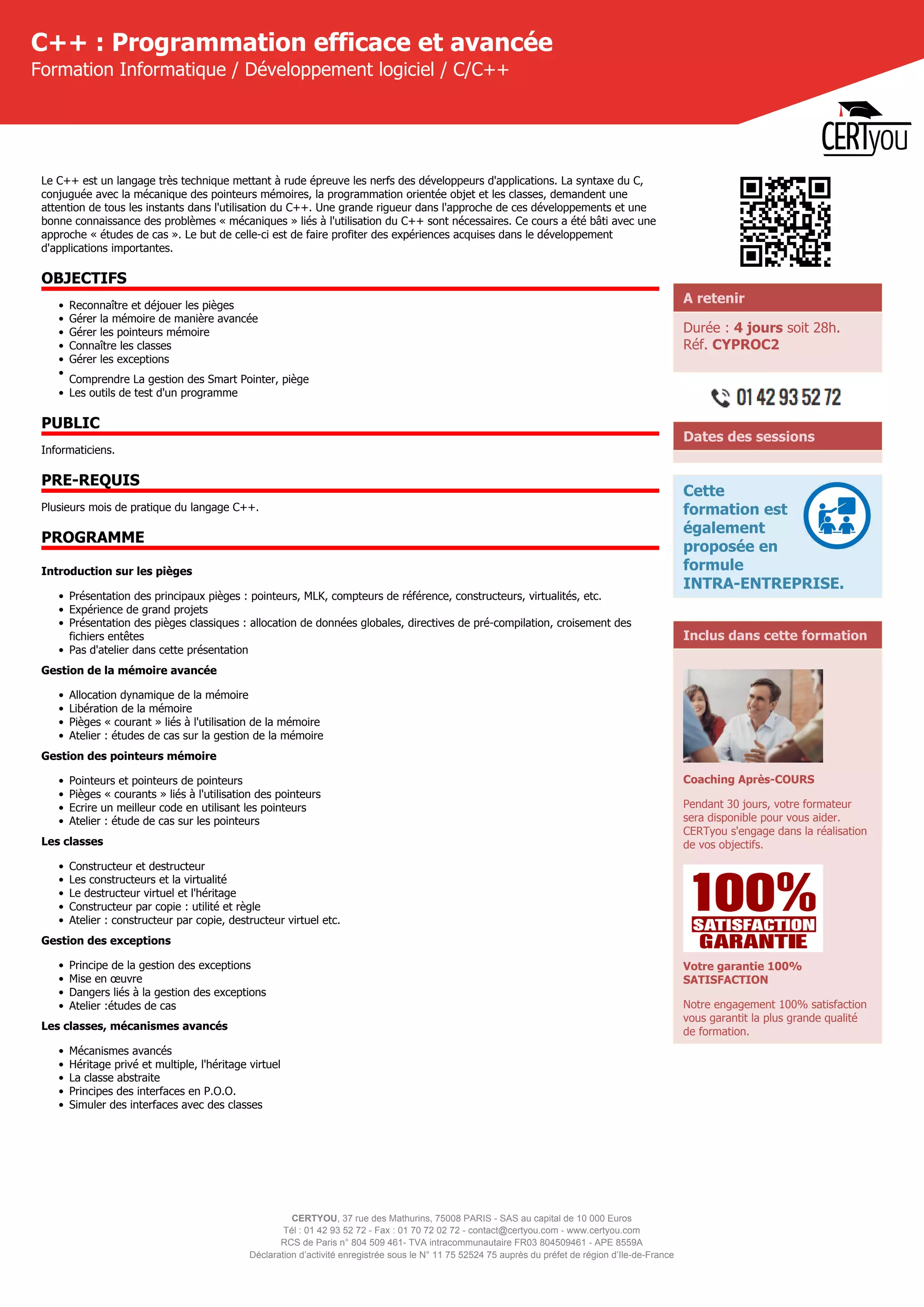 La formation C++ de Certyou, d'une durée de quatre jours, aborde des concepts avancés du langage, tels que la gestion de mémoire, les pointeurs et les classes, ainsi que la gestion des exceptions. Elle inclut également des études de cas afin d'illustrer les pièges courants et favorise une approche pratique et rigoureuse. Un coaching après-cours pendant 30 jours est prévu pour assurer la satisfaction des participants.
