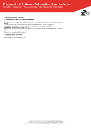 La formation proposée par Certyou à Paris, d'une durée de 2 jours, vise à comprendre l'architecture et l'évolution des systèmes d'information dans les entreprises, en abordant des sujets tels que la virtualisation, cloud computing, ainsi que les différentes architectures techniques. Destinée à un public souhaitant acquérir des connaissances fonctionnelles sur le système d'information, elle inclut également des aspects pratiques de la gouvernance, de la sécurité et de l'hébergement des systèmes. Le programme comprend des sensibilisations variées allant de la législation à la haute disponibilité, avec un accompagnement post-formation proposé.