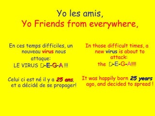 Le document est une invitation à une fête spéciale célébrant le 100e anniversaire du virus d - e - g - a, un virus métaphorique de bonheur. L'événement aura lieu à Paris le 12 décembre et n'invite que les membres proches d'un groupe exclusif. Les organisateurs insistent sur l'importance de la présence des invités pour rendre la soirée mémorable.
