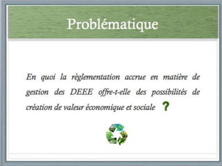 Le dossier examine comment la réglementation sur la gestion des déchets d'équipements électriques et électroniques (DEEE) peut générer de la valeur économique et sociale. Il met en avant l'importance du recyclage des DEEE pour réduire l'impact environnemental tout en créant des emplois et une économie circulaire. Une enquête réalisée par des étudiants aborde les perceptions et la gestion de ces déchets dans les entreprises.