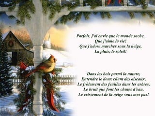 L'auteur exprime sa passion pour la vie et la nature, soulignant la beauté des simples plaisirs comme marcher sous la neige ou entendre le chant des oiseaux. Il appelle les gens à profiter de ces merveilles et à apprécier leur santé, tout en dénonçant l'injustice de la maladie. Au final, il incarne l'idée que la véritable joie réside dans la connexion à la nature et aux petits moments du quotidien.