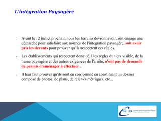 Avant le 12 juillet prochain, tous les terrains doivent avoir satisfait aux normes d'intégration paysagère ou prouvé leur conformité. Les terrains de camping existants doivent respecter les normes d'urbanisme et d'insertion paysagère selon la loi Grenelle 2, avec des aménagements soumis à un permis d'aménager dans un délai de trois ans. Les exploitants en non-conformité après huit ans risquent une mise en demeure et potentiellement une fermeture par le maire si les obligations ne sont pas remplies.