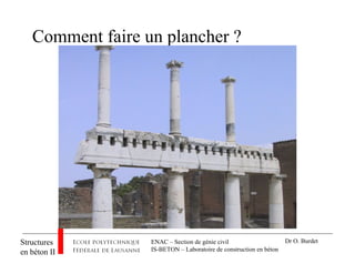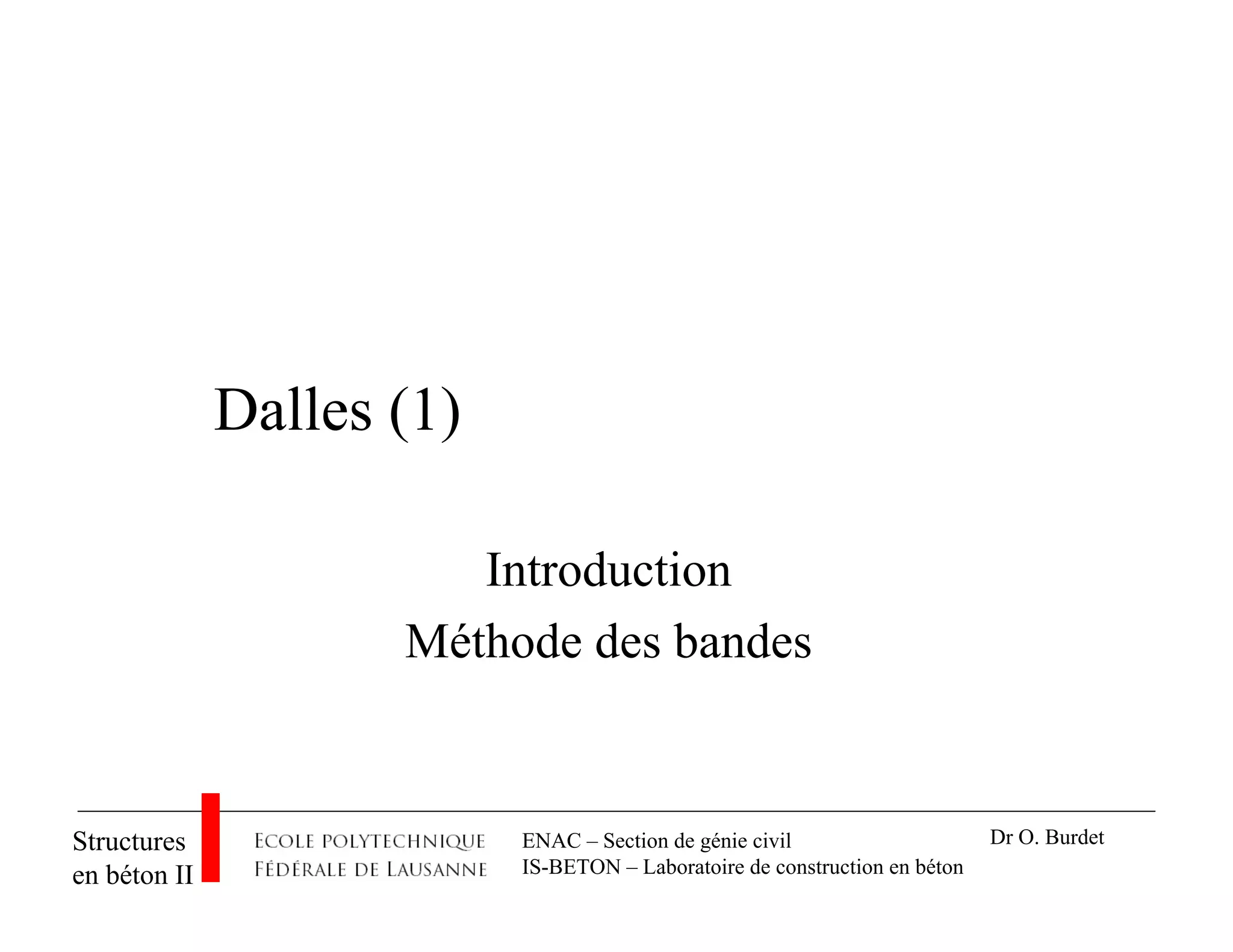 Le document traite des différents types de dalles en béton et des méthodes de dimensionnement et d'exécution dans les structures de bâtiment. Il aborde également la théorie de la plasticité et présente diverses applications pratiques comme la méthode des bandes pour le calcul des moments. Enfin, il met en évidence les caractéristiques, avantages et inconvénients de chaque type de dalle, ainsi que les calculs associés pour leur conception.