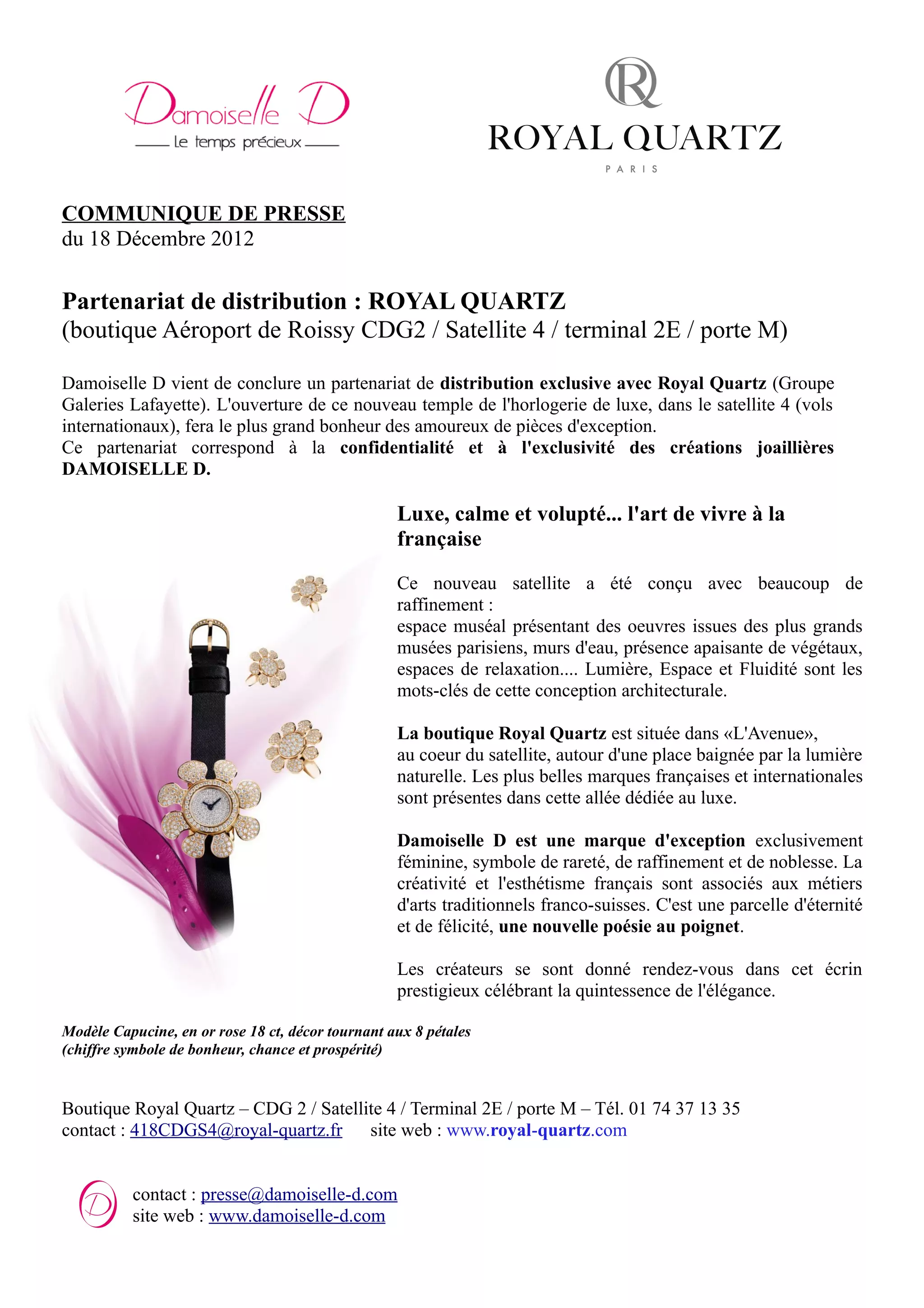 Damoiselle D a annoncé un partenariat exclusif avec Royal Quartz pour ouvrir une nouvelle boutique d'horlogerie de luxe à l'aéroport de Roissy CDG, dans le satellite 4. Cet espace raffiné mettra en avant des créations joaillières exceptionnelles et contribuera à célébrer l'art de vivre à la française. La boutique, située dans une allée lumineuse, proposera des marques de luxe françaises et internationales.