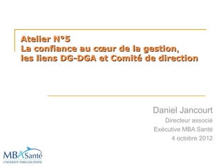 L'atelier n°5 aborde la thématique de la confiance dans la gestion des établissements de santé en France, en mettant l'accent sur la gouvernance, le pacte de confiance et les compétences requises. Il souligne l'importance de la confiance mutuelle entre les dirigeants et leurs subordonnés pour améliorer la performance organisationnelle. En conclusion, il invite à réfléchir sur les outils nécessaires pour acquérir et renforcer cette confiance.
