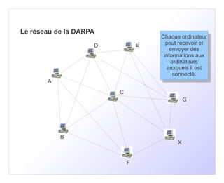 Le réseau de la DARPA est constitué d'ordinateurs interconnectés capables de recevoir et d'envoyer des informations entre eux. Lorsqu'un relais est détruit, les informations empruntent un autre chemin, et un autre ordinateur peut devenir relais pour continuer la transmission. Ce réseau présente ainsi des redondances et des options alternatives pour assurer la continuité des communications.