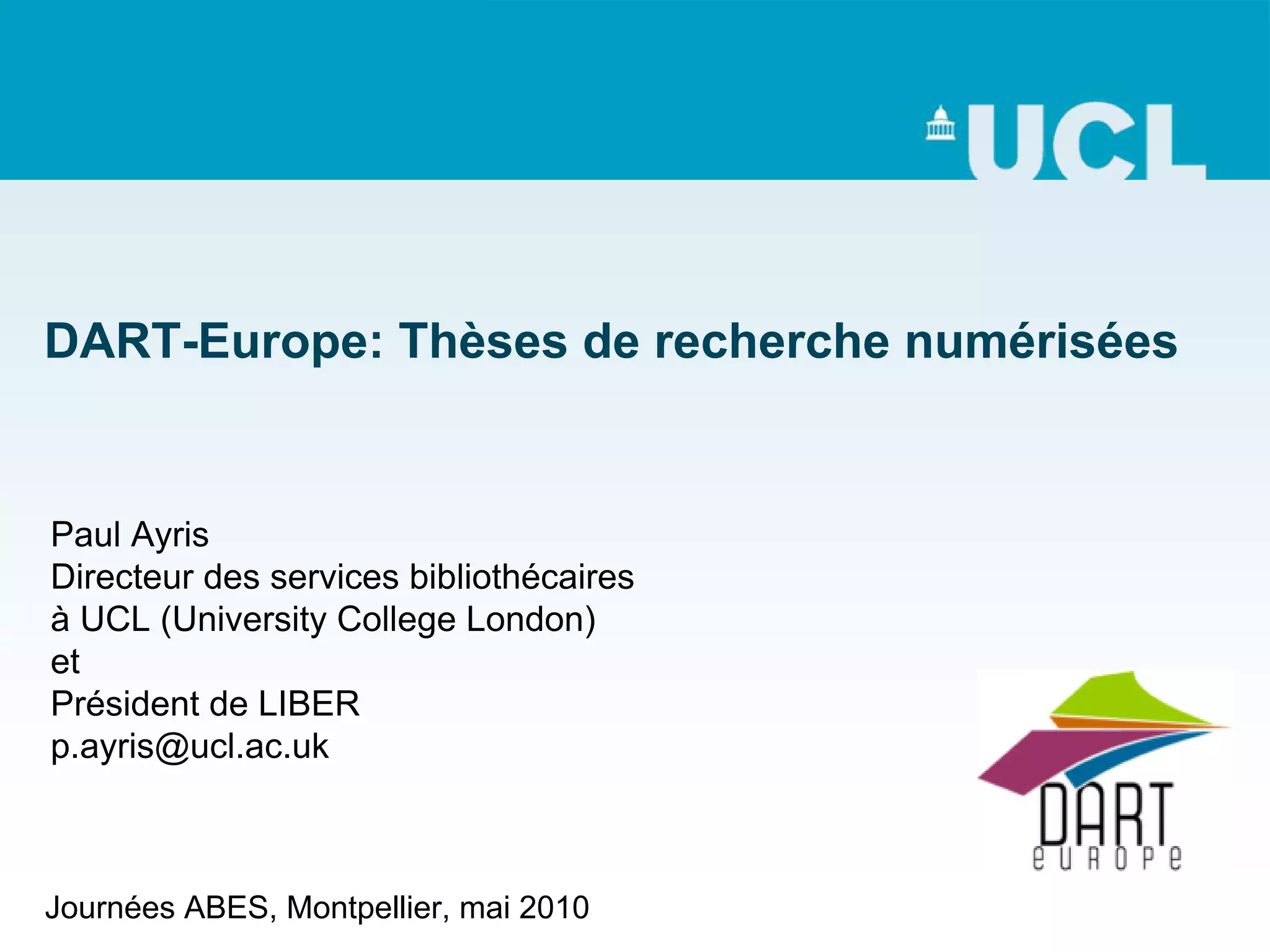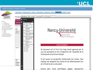 DART-Europe est une initiative fondée en 2005 pour gérer et diffuser les thèses numériques librement accessibles en Europe, impliquant une collaboration entre bibliothèques et consortiums. Le portail DART-Europe offre un accès à près de 200 000 thèses, et a vu une augmentation significative de son utilisation, favorisant ainsi la visibilité des recherches et le libre accès. Le projet est également connecté à Europeana, visant à améliorer l'accès aux ressources culturelles numériques en Europe.