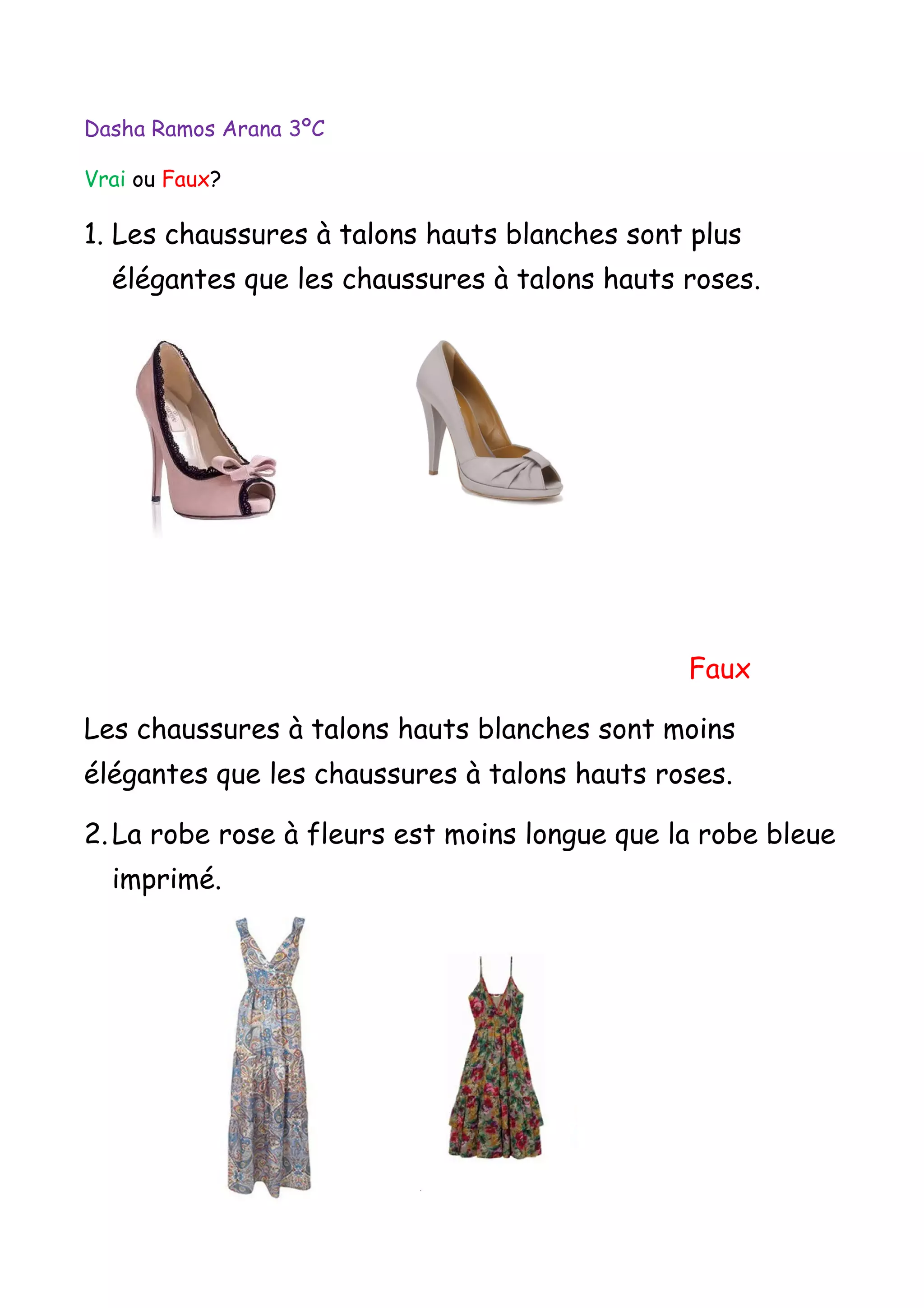 Le document présente une série d'affirmations sur des vêtements et accessoires, jugées vraies ou fausses. Il conclut que les chaussures blanches sont moins élégantes que les roses, tandis que la robe rose est plus courte que la bleue. De plus, il indique que des lunettes de soleil noires sont plus grandes que les marron et que le maillot de bain imprimé est plus joli que le noir.