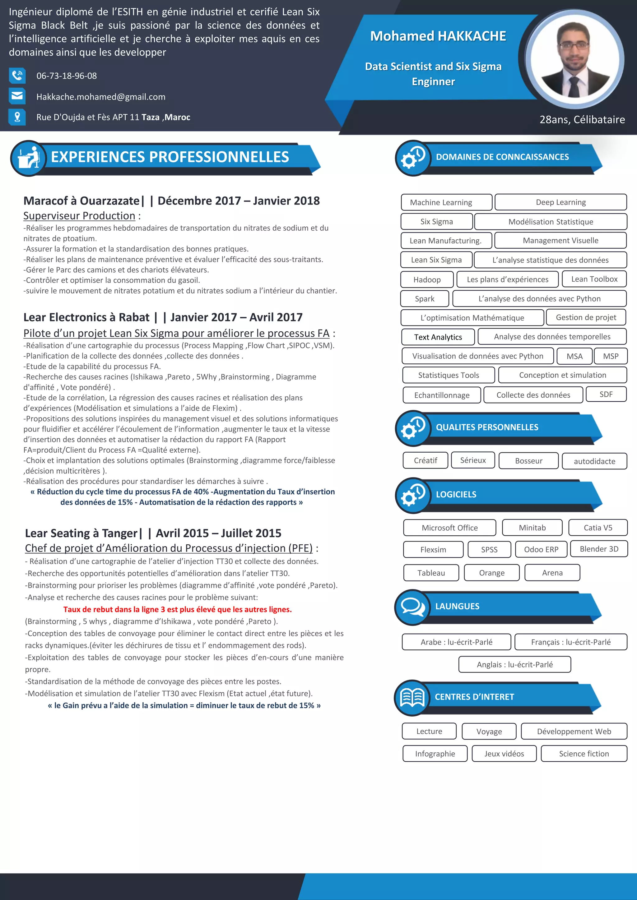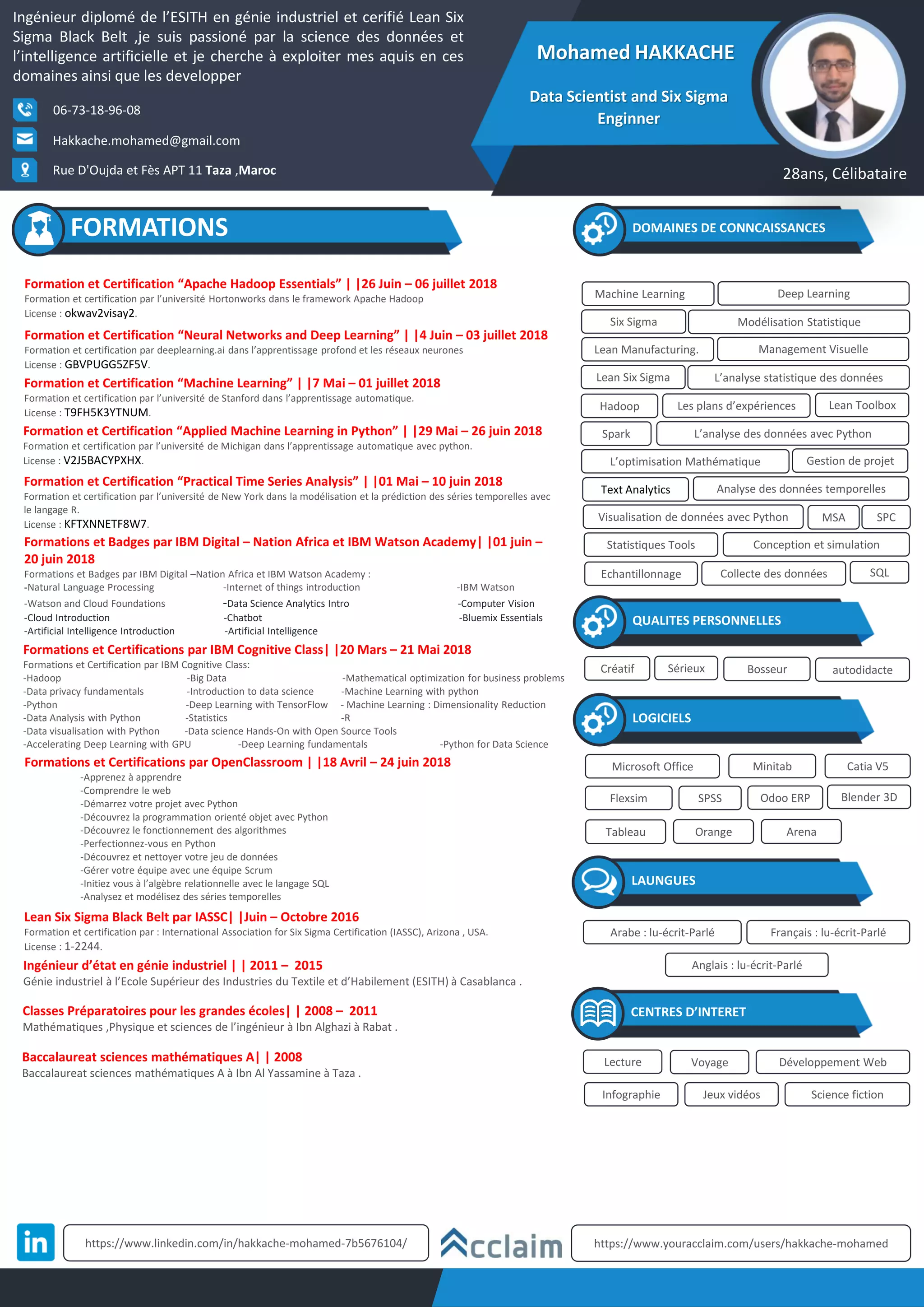 Mohamed Hakkache est un data scientist et ingénieur six sigma certifié, diplômé en génie industriel de l'ESITH, passionné par la science des données et l'intelligence artificielle. Il possède de nombreuses compétences en machine learning, deep learning, Lean Six Sigma et a suivi plusieurs formations et certifications prestigieuses dans ces domaines. Avec une expérience professionnelle variée, il a travaillé sur l'optimisation de processus et des projets à fort impact dans l'industrie.