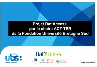Le projet dat’access de la chaire act-ter de la fondation université bretagne sud vise à améliorer l'accès à l'information sur les lieux et services accessibles pour les personnes à autonomie limitée, incluant notamment les femmes enceintes et les personnes âgées. Ce projet repose sur la collecte, la normalisation et la diffusion des données via une plateforme open data pour favoriser une meilleure accessibilité. Il ambitionne également de renforcer la collaboration entre l'université, les entreprises, les collectivités, et le milieu associatif.