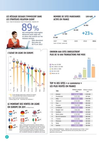 En 2011, le marché de l'e-commerce et des ventes à distance en France a atteint 37,7 milliards d'euros, avec 77 % des Français faisant des achats en ligne. Les secteurs les plus populaires incluent l'habillement, le mobilier et les produits culturels. Les entreprises adoptent de plus en plus les réseaux sociaux pour interagir avec les clients, et le nombre d'acheteurs en ligne continue de croître.