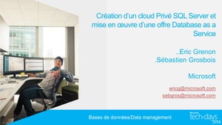 Le document présente la création d'un cloud privé SQL Server et l'implémentation d'une offre Database as a Service (DBaaS) par Microsoft. Cette offre, adaptée aux besoins spécifiques des clients, permet une gestion optimisée et une extensibilité des ressources tout en réduisant les coûts et en améliorant l'agilité. Les DBA peuvent ainsi se concentrer sur des tâches à forte valeur ajoutée, grâce à des outils de supervision et d'automatisation.