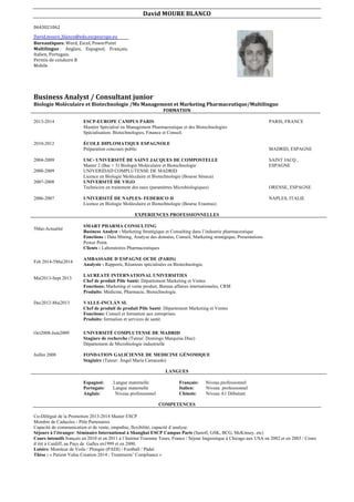 David Moure Blanco est un business analyst et consultant junior en biologie moléculaire et biotechnologie, avec un mastère spécialisé en management pharmaceutique de l'ESCPEurope. Il possède des compétences en marketing stratégique et a travaillé pour des entreprises pharmaceutiques et des universités en Espagne et à Paris. Multilingue, il parle couramment l'espagnol, le portugais, l'anglais, le français et l'italien.